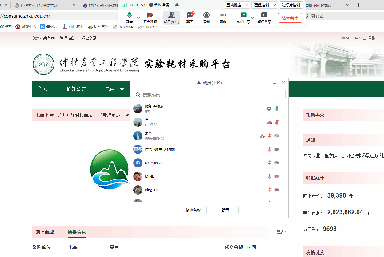 7月10日上午,bevictor伟德官网采用线上会议方式举办实验耗材采购无纸化报账第二次培训,bevictor伟德官网副部长梁海燕主讲,工程师吴强负责答疑,会议由bevictor伟德官网信息科科长朱蓉主持。本次培训的主要内容包括:项目负责人在智能报账系统的填报单据授权操作、发票和销货方银行账户信息的重新推送操作、如何防止采购价格虚高的手段和措施和其他相关问题的答疑等。各学院、各部门 ,项目负责人、研究生、二级单位办公室主任共计108人参加培训。